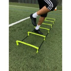 Vous avez la possibilité de disposer cette échelle à plat pour le travail spécifique de pied ou de surélever les barreaux pour effectuer de la pliométrie légère et des montée de genoux.