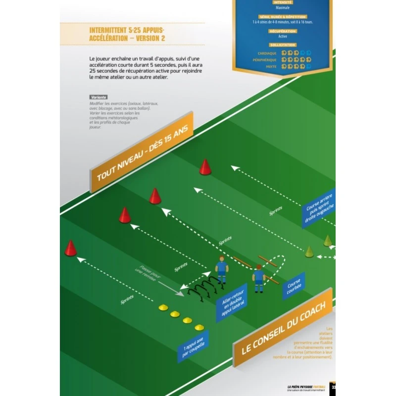 Bien que le football ne soit pas qu’une activitĂ© athlĂ©tique, le staff technique doit essayer de proposer diffĂ©rentes formes d’exercices intermittents : avec ou sans ballon, pour l’ensemble du groupe ou pour un groupe de joueurs restreint, spĂ©cifique au poste, incluant de la motricitĂ©, en phase de rĂ©athlĂ©tisation,en prĂ©-saison…
